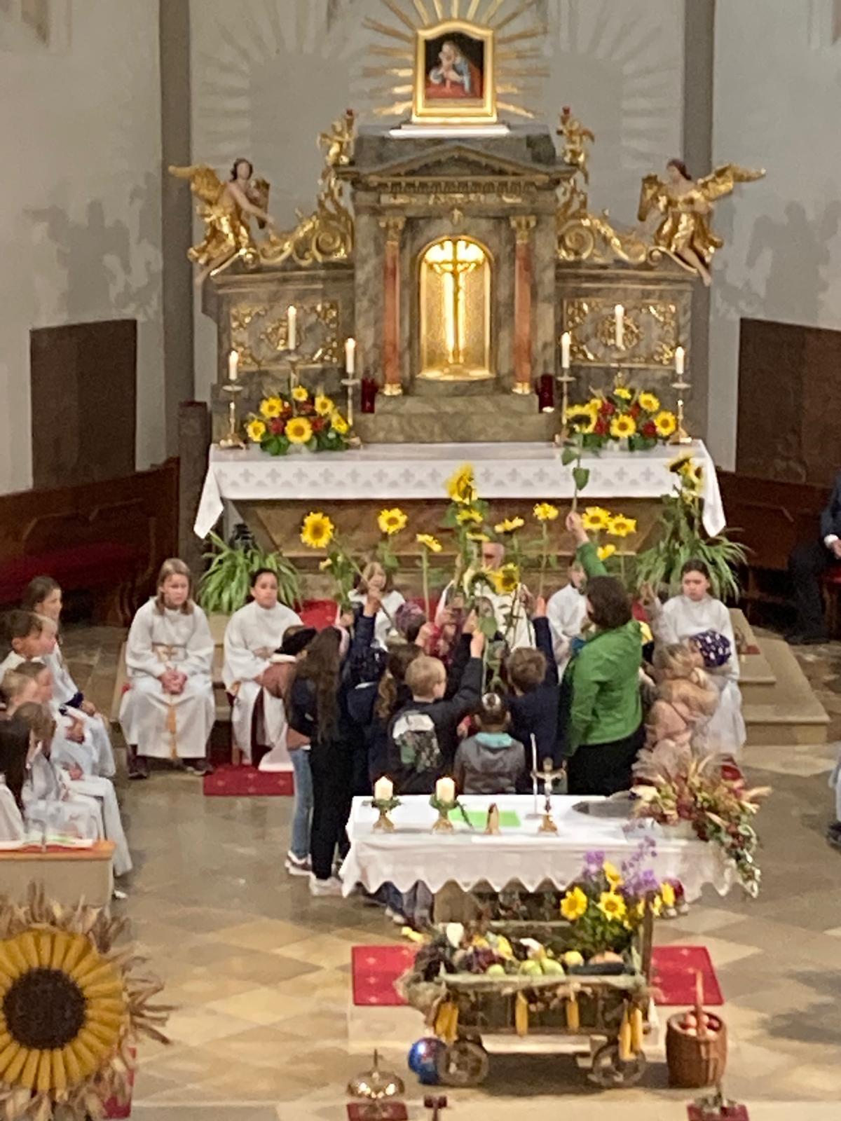Mit Musikalischer Begleitung der Trachtenmusikkapelle wurde die, von der Bauernschaft, gebundene Erntekorne zum Altar gebracht um anschließend die Festmesse zu feiern! Dabei wurde Gott besonders geehrt, mit dem „Sonnenblumentanz“ zum Gloria der neuen Erstkommunionkinder!